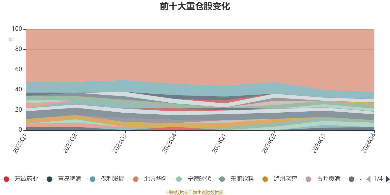 截至2024年四季度末,基金十大重仓股分别是贵州茅台、五粮液、宁德时代、鱼跃医疗、海尔智家、山西汾酒、青岛啤酒、新华保险、迎驾贡酒、东鹏饮料。